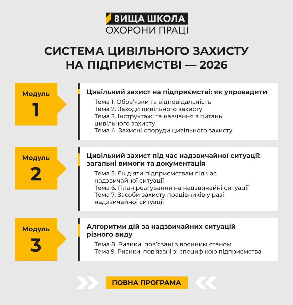 Створити на підприємстві дієву систему цивільного захисту — одне з найважливіших завдань керівника та його команди. Особливо актуально це в умовах воєнного стану. Отримати або оновити знання з цивільного захисту вам допоможе нова програма від Вищої школи охорони праці.