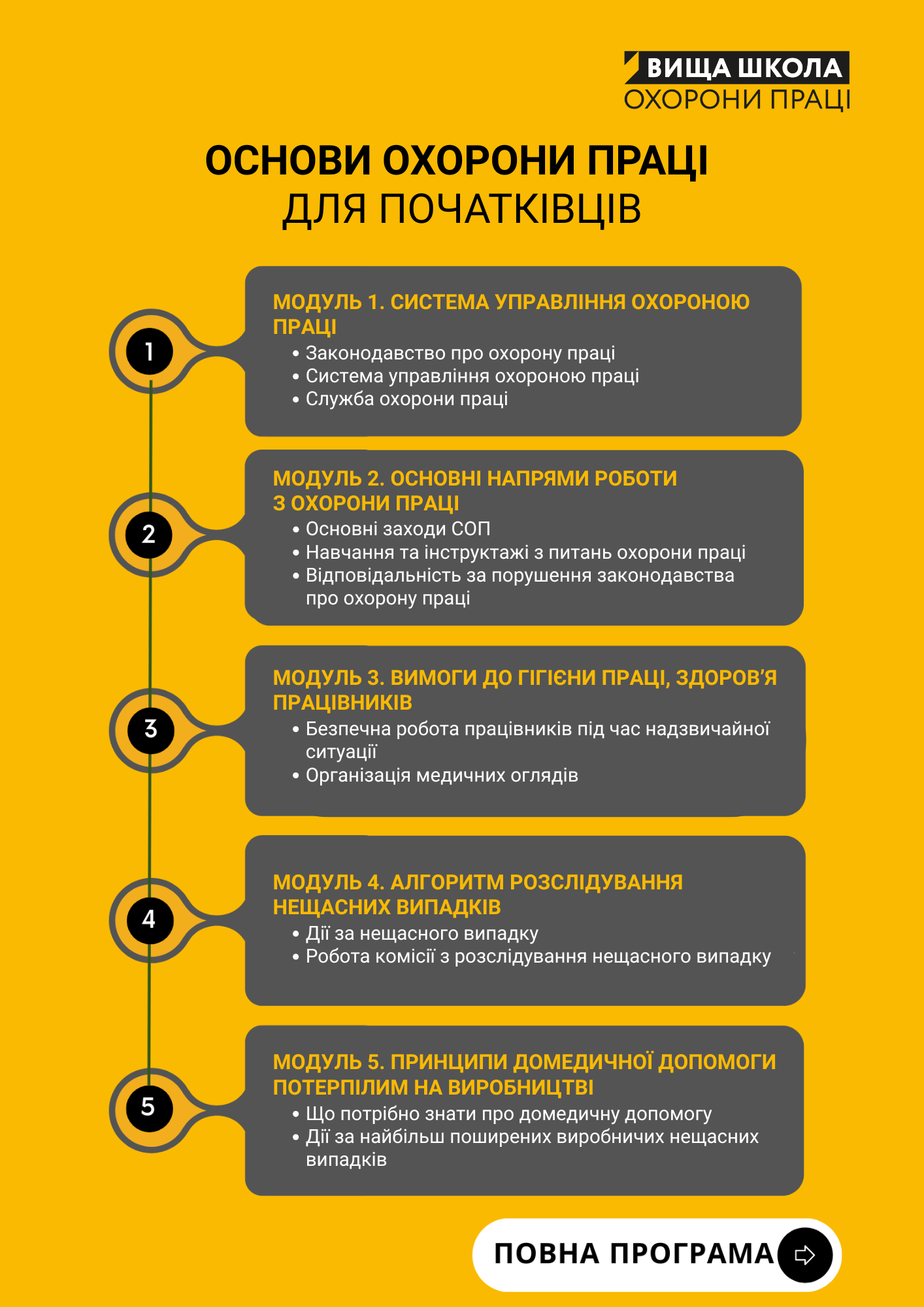 Навчальна програма «Основи охорони праці для початківців» — це системна підготовка фахівця з ОП: від базових вимог до алгоритмів дій у критичних ситуаціях.