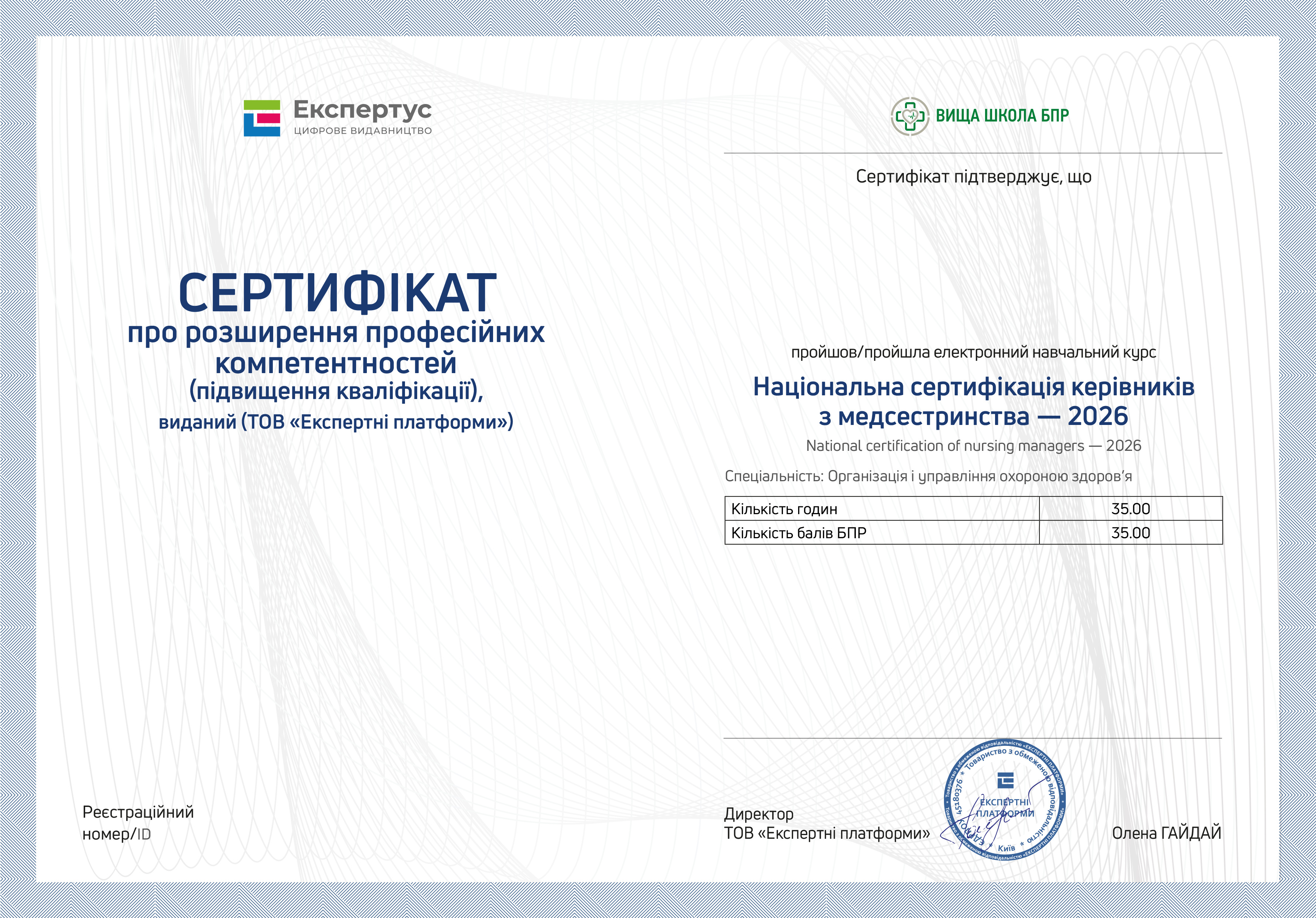 Навчальний курс «Національна сертифікація керівників з медсестринства — 2026» містить 35 годин.